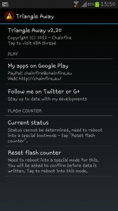 Jedesmal wenn ihr etwas flasht, dass nicht offiziell von Samsung ist erhöht sich der Binary Counter um 1. Daran können die Service Techniker im Garantiefall erkennen, dass etwas am Gerät verändert wurde und euch daraufhin die Garantie verweigern. Mit Triangel Away (Root ist Voraussetzung) habt ihr die Möglichkeit diesen “Custom Binary Download” Counter wieder auf 0 zu setzen. Allerdings bleibt der Wert für “System Status” in jedem Fall auf custom stehen. Weiter gilt zu beachten, dass der Wert des Counters nur bei “Root only” bei 0 bleibt, während er bei “Root & CWM” nach jedem Start wieder bei 1 steht. Die Details könnt ihr in Chainfires xda-Thread Triangel Away nachlesen.