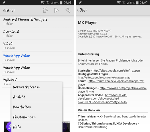 Um zu testen ob der Codec richtig installiert ist, ruft ihr entweder einen Film mit AC3 Ton auf oder ruft im MX Player das “Hilfe” Menü und danach den Punkt “Über” auf. Unter der Versionszeile des Players sollte sich nun der Punkt Angepasster Codec 1.7.32 befinden.