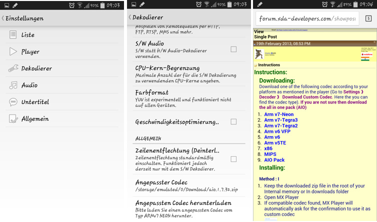 Um die passenden Codecs nachzuinstallieren ruft ihr innerhalb der App die “Einstellungen” und danach den Punkt “Dekodierer” auf. Scrollt nun ganz nach unten und klickt auf den Punkt “Angepassten Codec herunterladen”, der euch zum xdadevelopers Thread von Entwickler ktsamy weiterleitet. In seinem Thread stellt der Entwickler die fehlenden Custom Codecs für die verschiedenen Hardware Plattformen bereit. Als Beispiel sei erwähnt, das z.B. sowohl für das Galaxy Note 3, das Galaxy S5, das Galaxy Tab S 8.4 als auch das Nexus 7 2013 der 1. Punkt “ARM v7 Neon” gewählt werden muss. Seid ihr unsicher welche Hardware in eurem Androiden verbaut ist könnnt ihr auch den Punkt 9 “AIO Pack” auswählen, der alle Plattformen enthält, aber mit über 40 Megabyte auch den größten Download verursacht. Achtet bitte darauf das Zip File in das interne Root Verzeichnis bzw. den Download Ordner eures Androiden herunterladen.