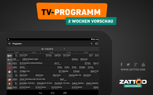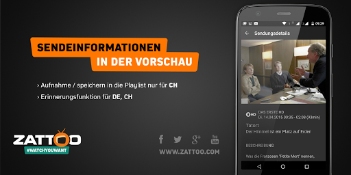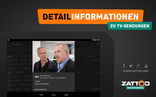 Alle Sendungen in einer App: Tagesschau, Tour de France, Tatort, Morgenmagazin, UEFA Champions League, Sportschau, WM, EM, Bundesliga, Tennis (Wimbledon), Doppelpass, Polizeiruf 110, Circus Halli Galli, Der Bachelor/ Die Bachelorette, alle Serien usw. immer live und aktuell auf allen Geräten fernsehen. TV-Tipps gibt’s auch hier: www.zattoo.com oder in unserem Newsletter.